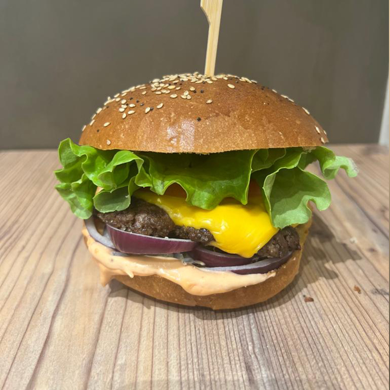 Boeuf (110g), salade, tomate, oignons grillés, cheddar, sauce maison.